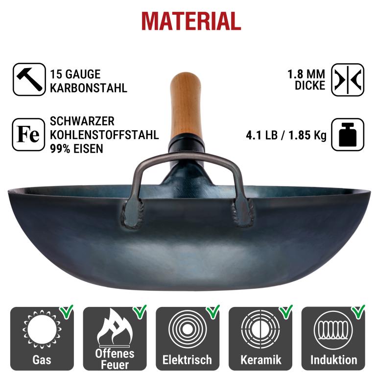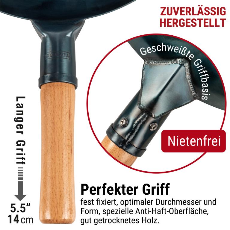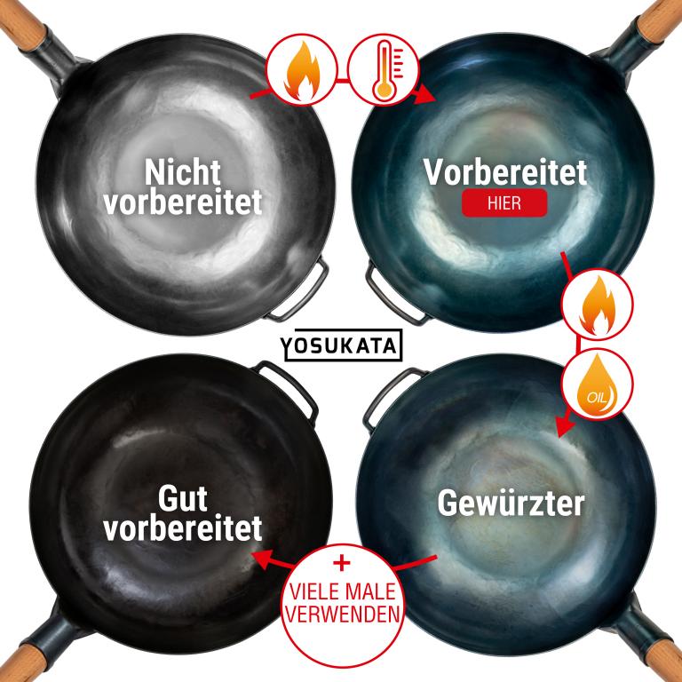 PRE-SEASONED: YOSUKATA blue carbon steel wok flat bottom pan is pre seasoned at high temperatures over 600F using special technics. It takes just a few minutes to fully season this traditional Japanese pan with oil and start cooking right away. PREMIUM GRADE QUALITY for LIFETIME USE: This traditional hand hammered carbon steel pow wok is extra-sturdy. Each wok flat bottom pan is made of high-quality carbon steel using traditional production technology. MULTIPURPOSE: This is the best wok carbon steel cookware for cooking delicious, healthy meals as it retains the juice and flavor within ingredients. Perfect for pan-frying, braising and deep-frying. Sturdy: The spatula and ladle feature one-piece construction. They are made of high-quality carbon steel without using any additive. Unlike wooden wok spatulas and ladles, our metal wok spatula and ladle will not bend, break or lose shape. NOTE: Seasoning is required before use. Check the step-by-step guide included in the kit on preparing wok tools before your first use. Maximize your wok's functionality: Our stainless steel 12.8-inch lid cover traps and distributes heat evenly for more efficient cooking. These wok utensils concentrate all the flavors, so your food tastes better.