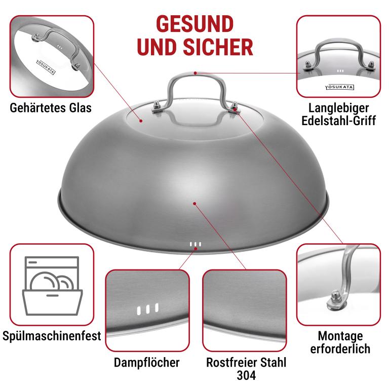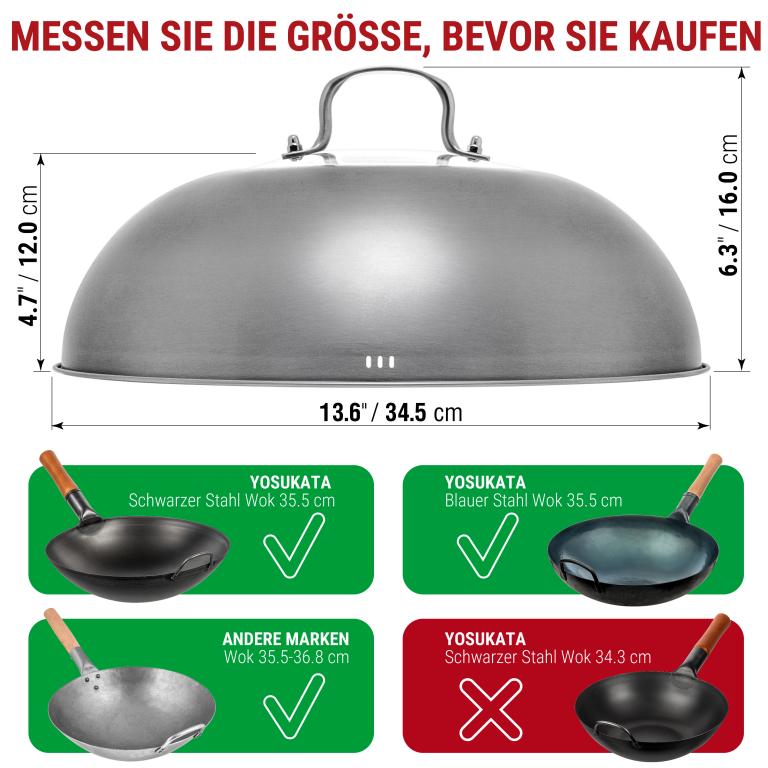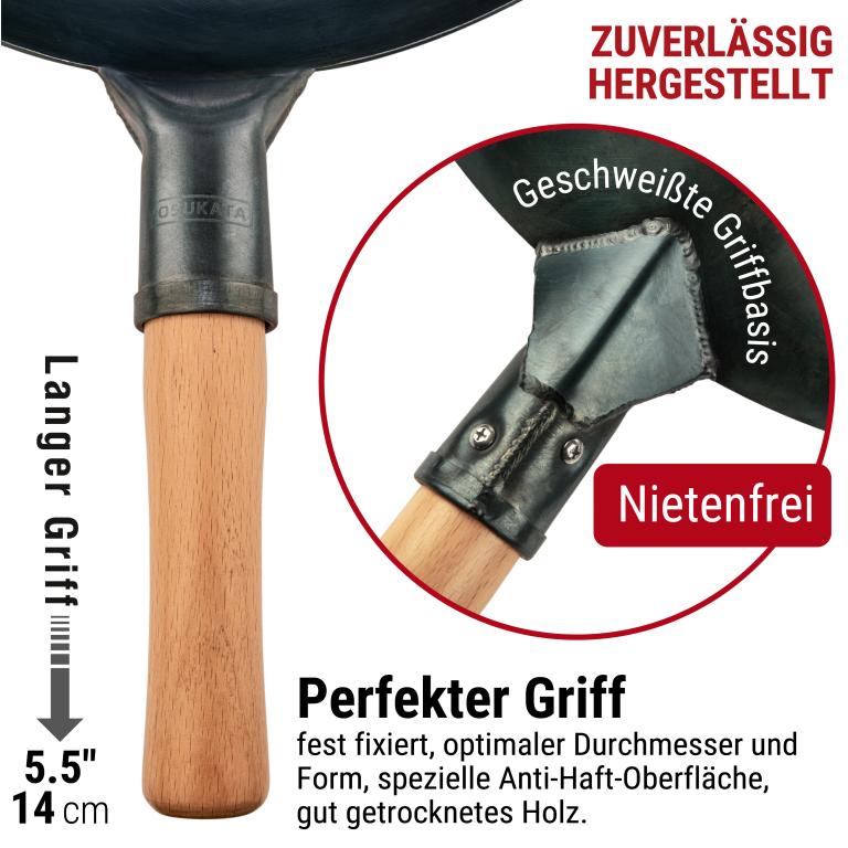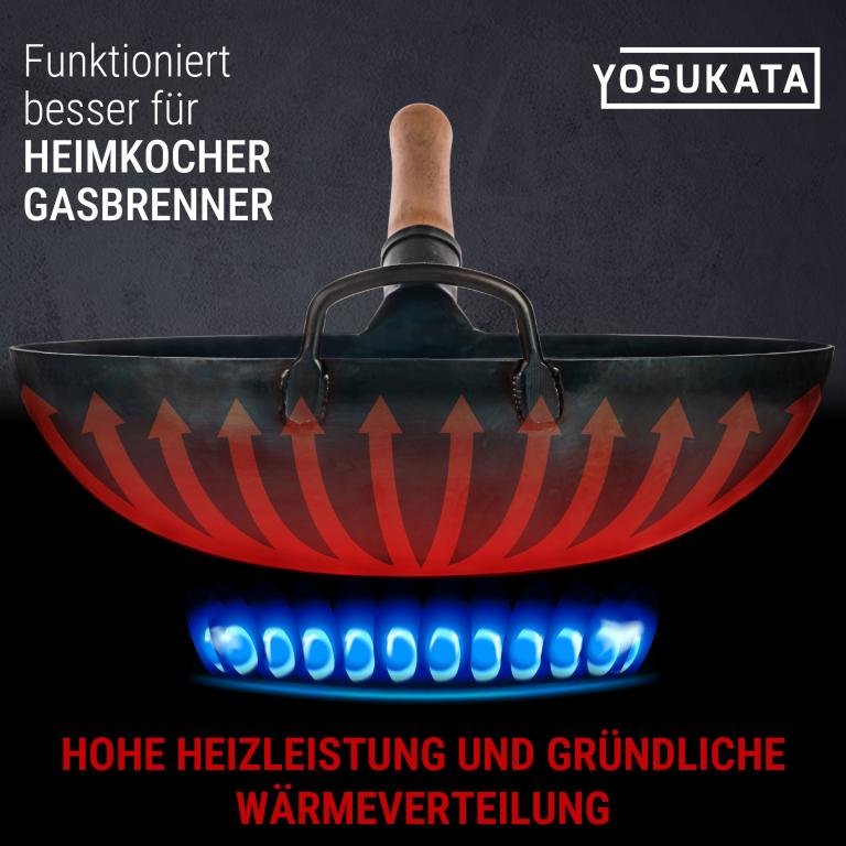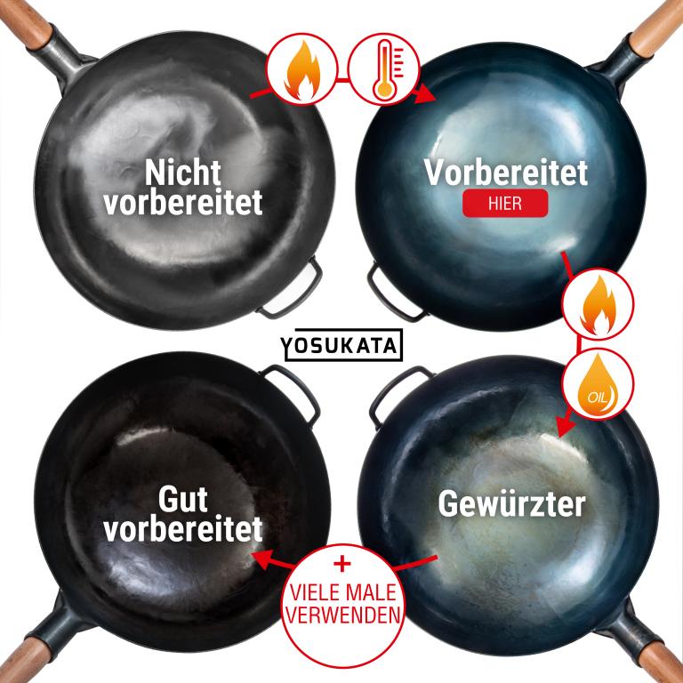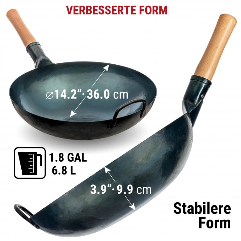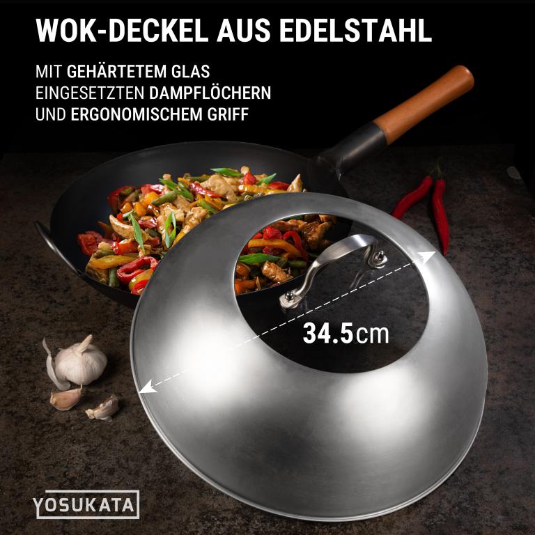 HOCHWERTIGE MATERIALIEN: Dieser traditionelle handgehämmerter Wok ohne chemische Beschichtung ist aus hochbelastbarem Kohlenstoffstahl professioneller Qualität gefertigt. Das ergonomische Design des Holzgriffs sorgt für einen bequemen Griff, wenn Sie diesen unbeschichteten Wok verwenden. VORBEHANDELT: Unsere Wok-Pfanne aus Kohlenstoffstahl mit hoher Hitzebeständigkeit wird im Gegensatz zu anderen, unbehandelten Woks und Pfannen bei hohen Temperaturen über 300° C unter Verwendung spezieller Techniken vorbehandelt. Wie bei jedem chinesischen Wok ist eine weitere vollständige Vorbehandlung mit Öl notwendig. ECHTER GESCHMACK: Entdecken Sie die reichhaltigen, authentischen Aromen der chinesischen und anderen asiatischen Küchen in Ihrem eigenen Zuhause. Die Handgehämmerte Wokpfanne mit rundem Boden von Yosukata mit einem Durchmesser von 36 cm wurde speziell entwickelt, um die Säfte und den Geschmack in den Zutaten zu versiegeln. Unser Wok ist für den Einsatz als Camping-Wok, Wok-Grill, Wok für Gasherd geeignet und kann auch über dem offenen Feuer benutzt werden Maximieren Sie die Funktionalität Ihres Woks: Unser universeller wok deckel 34,5 cm schließt die Hitze ein und verteilt sie gleichmäßig für effizienteres Kochen. Diese Wok-Utensilien konzentrieren alle Aromen, damit Ihr Essen besser schmeckt. Ideale Länge: Unser 43 cm Edelstahl xxl pfannenwende und Schöpflöffel und Schöpflöffel sind lang genug, um bequem in 32–36 cm oder größeren Woks zu kochen. Mit diesem langen Pfannenwender sind Ihre Hände beim Kochen sicher